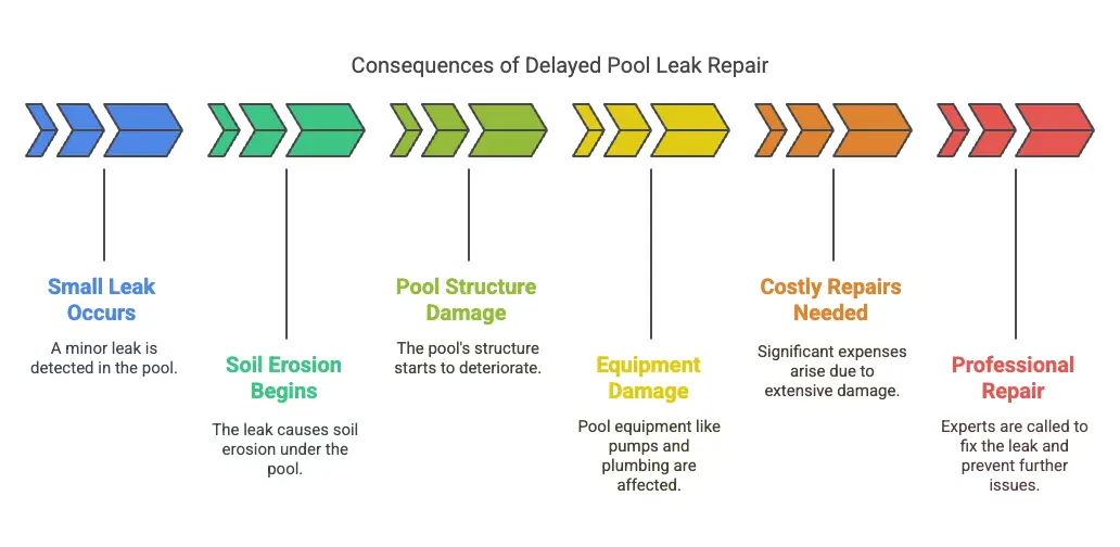 Delaying pool leak repair can lead to bigger problems. A small leak can cause soil erosion under your pool, damage the pool structure, or even lead to slab leaks. Water leaks left untreated can also damage pool equipment, like your pool pump or plumbing lines, leading to costly repairs down the road.