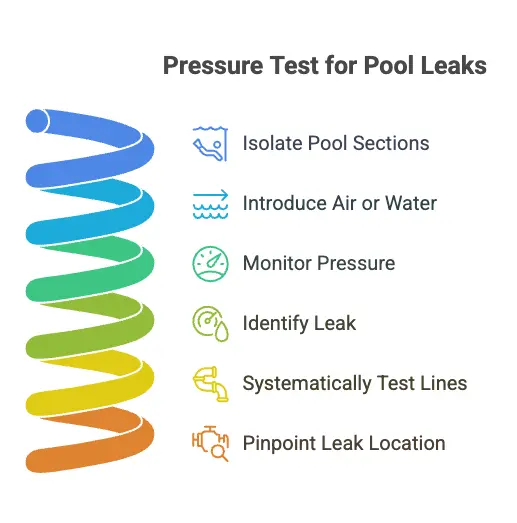 Pressure testing is a specialized leak detection process used to identify leaks in swimming pool plumbing systems. By isolating sections of the pool’s plumbing—such as suction lines, returns, or skimmers—and applying air or water pressure, technicians can determine if a pipe or fixture is losing pressure due to a leak.